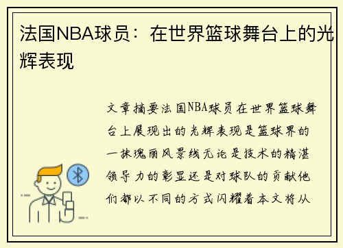 法国NBA球员在世界篮球舞台上展现出的光辉表现是篮球界的一抹瑰丽风景线。无论是技术的精湛、领导力的彰显还是对球队的贡献,他们都以不同的方式闪耀着。本文将从四个方面对法国NBA球员的表现进行详细阐述:其在球场上的技术表现、领导力的体现、对球队的贡献以及在国际赛事中的突出表现。通过对这些方面的探讨,可以更深入地理解法国球员在世界篮球舞台上的独特价值。